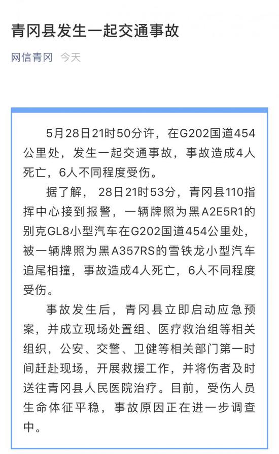 据了解, 28日21时53分,青冈县110指挥中心接到报警,一辆牌照为黑A2E5R1的别克GL8小型汽车在G202国道454公里处,被一辆牌照为黑A357RS的雪铁龙小型汽车追尾相撞,事故造成4人死亡,6人不同程度受伤。
