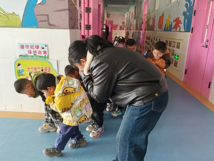 幼儿规范做好弯腰低头、湿毛巾捂口鼻动作
