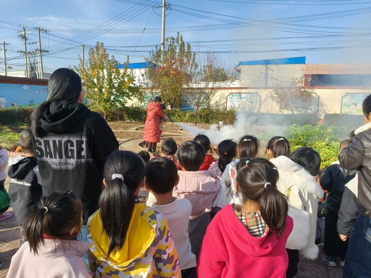 为深化教育效果,演练尾声还进行了消防安全知识理论宣讲环节。园长现场示范灭火器使用方法,通过“提、拔、握、扫”四步口诀精准讲解操作要领,生动演示吸引幼儿围拢观摩,现场学习氛围浓厚。?