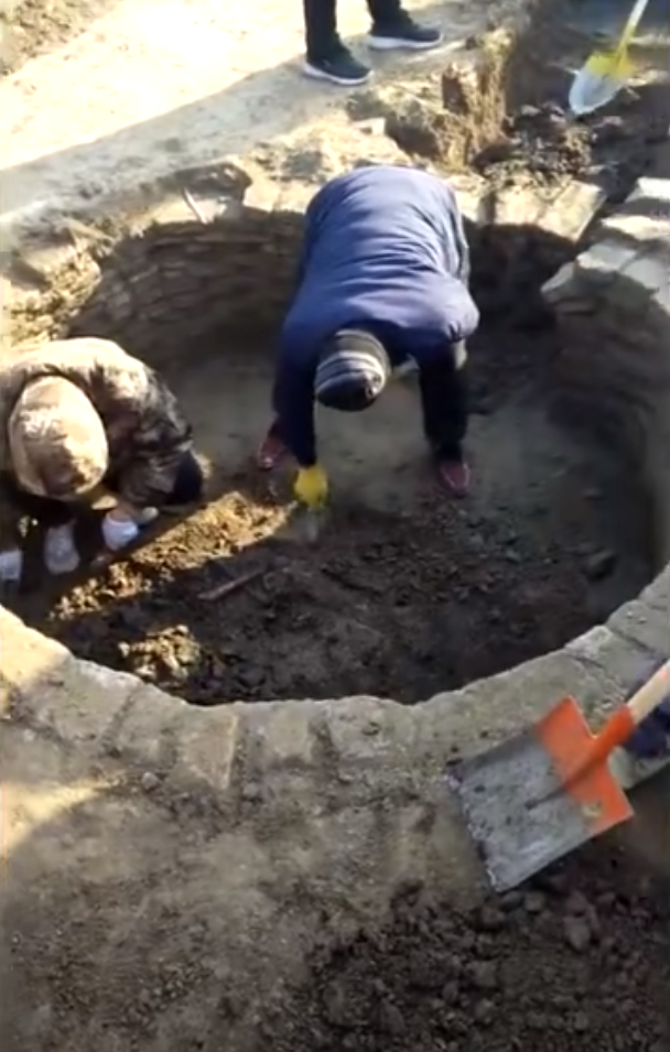 一段现场视频显示,数个圆形墓坑内,多名工作人员手持工具对墓葬进行清理。有工作人员站在墓坑外,手持铲子在铲土,一旁还有多位民众在围观。