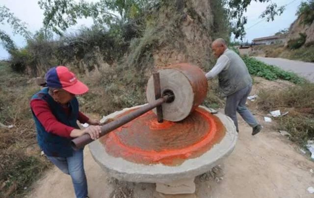 抓紧时间用石磨碾压着辣椒,