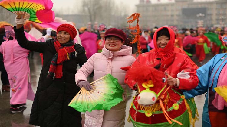 正值正月十五,伴随着落雪,河北省三河市在该市的文化中心广场举办2019年贺新春花会调演。早上8点,广场上就已聚集了大量的表演队伍,鼓声、镲声、唢呐声响彻广场每个角落。20多支来自不同乡镇的队伍占据广场各方,表演很快进入高潮。最热闹的是秧歌队、健身舞蹈队和舞龙舞狮队,他们穿着各自的表演服装,在雪中欢畅舞动,围观群众也为自己喜欢的队伍大声喝彩助威。