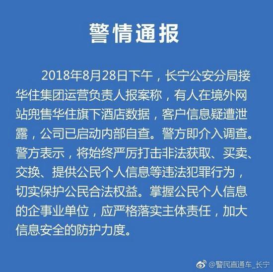 今日(28日),网络上出现大量用户、自媒体传播“出售华住旗下酒店数据”的消息,引起极其恶劣的舆论影响。我集团非常重视,已在内部迅速开展核查,确保客人信息安全;我集团已经第一时间报警,公安机关正在开展调查;我集团也聘请了专业技术公司对网上兜售的“相关个人信息”是否来源于华住集团进行核实。为正视听,特声明如下: