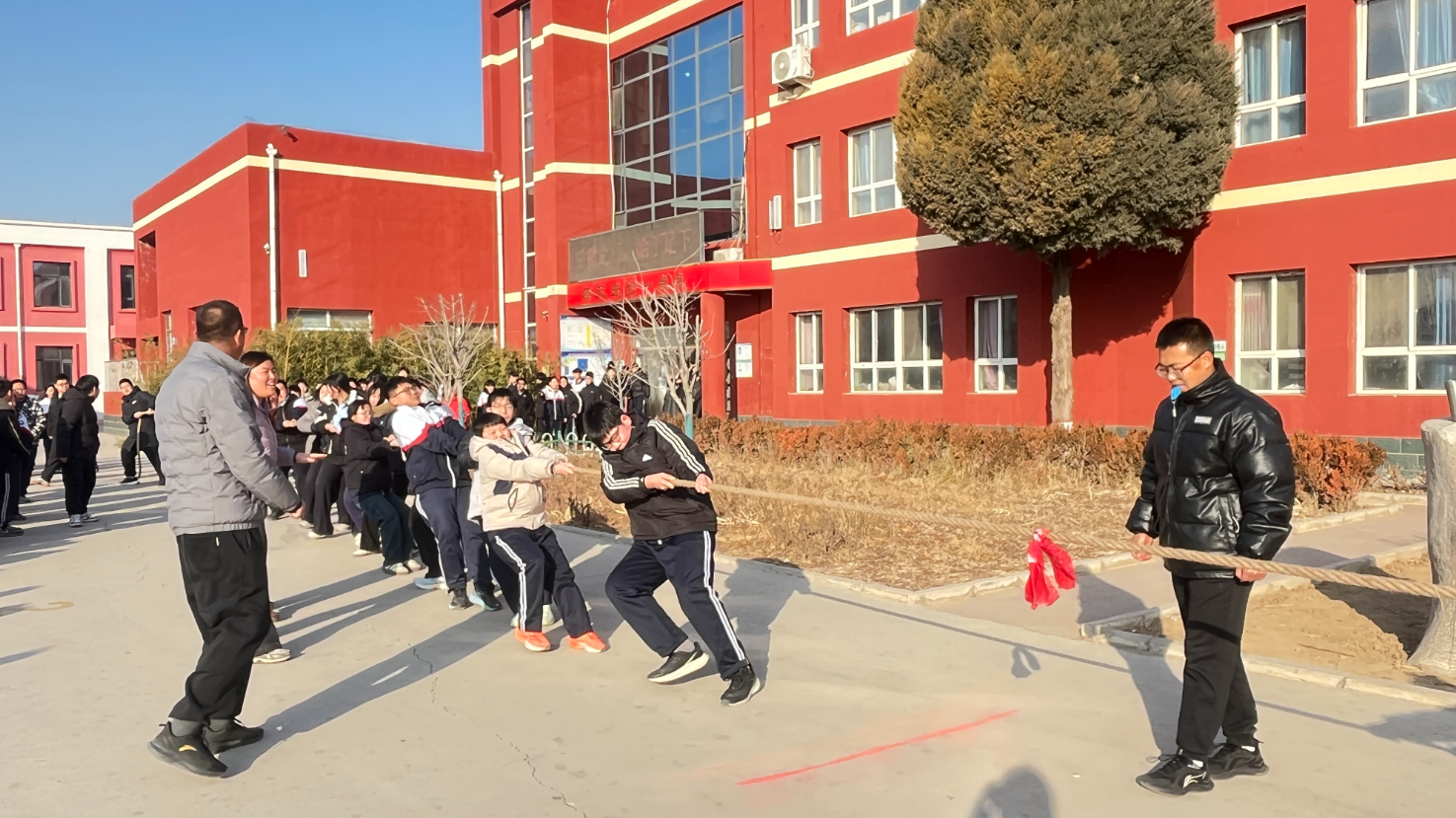 初赛阶段,各班级组成的参赛队伍依次登场,随着裁判哨声响起,队员们迅速扎稳马步,双手紧握长绳,身体后倾,在“一二、一二”的整齐号子声中奋力拼搏。绳中间的红绸带时而左移,时而右摆,双方你来我往、互不相让。场外啦啦队的呐喊声、加油声此起彼伏,震彻校园,班主任们也在一旁挥臂鼓劲,与学生们并肩作战。
