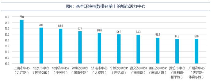 基于“基本环境指数”的排行可发现,相对于其他几项指标,71个城市活力中心在三项基本指标上表现尚可,如果仅考虑行人是否有路可走,上海市九江路表现最佳。