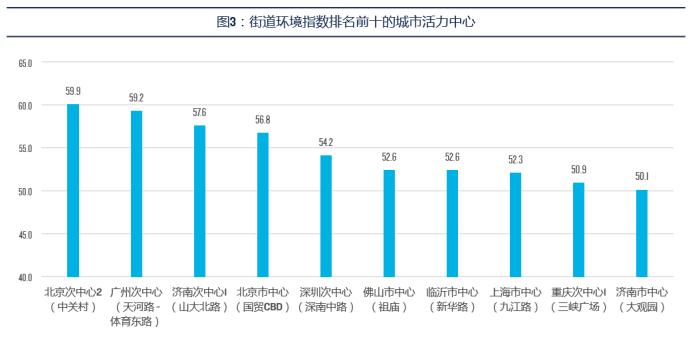 研究发现,71个城市活力中心的街道环境指数总体不高,平均为41.9分,其中北京市中关村、广州市天河路-体育东路和济南市山大北路排名前三。仅有10个城市活力中心的街道环境指数得分超过了50分,说明即便在人流密集、商业发达的城市活力中心,步行环境仍然有非常大的提升空间。